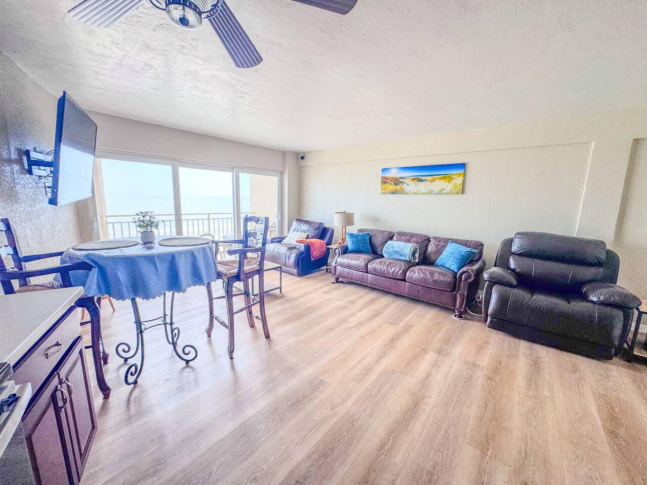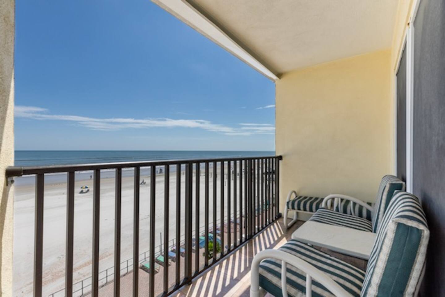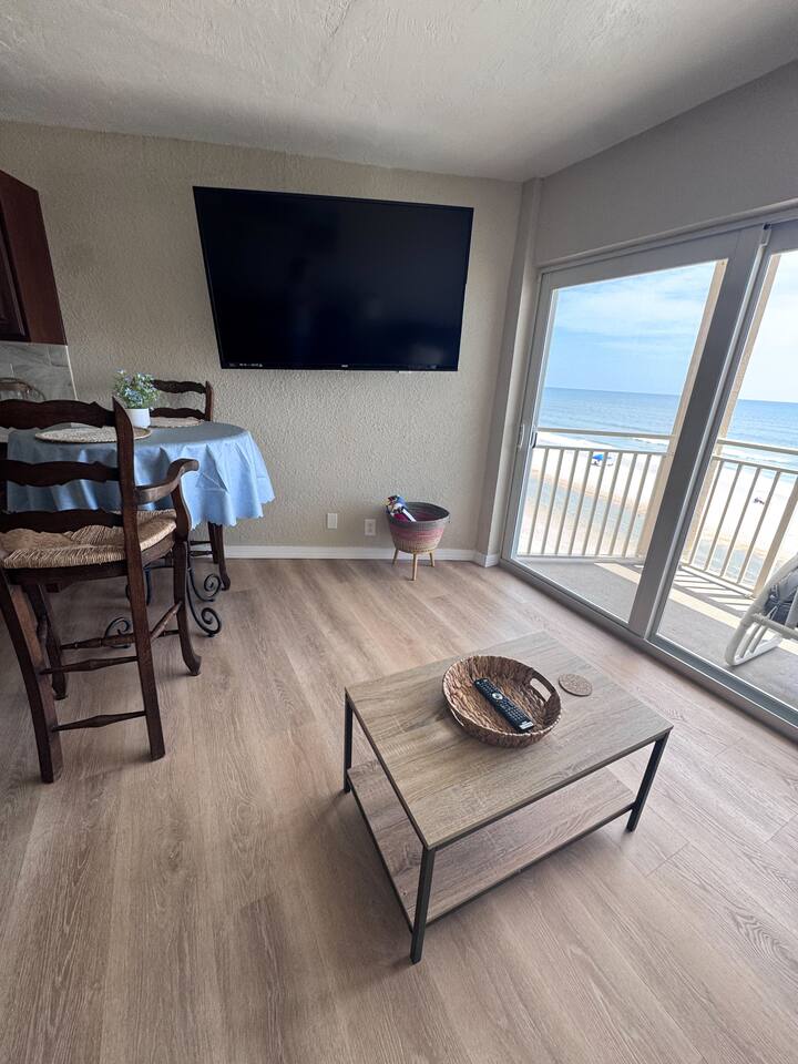 Welcome to The Blue Merlin, your personal slice of beachfront magic. Perched on the 4th floor of the Daytona Inn Beach Resort, this oceanfront condo offers floor-to-ceiling views of the Atlantic and direct beach access just steps from your door. Inside, you'll find a fully stocked kitchen, high-speed private WiFi, smart TVs, a King bed, and a Queen size pull out sleeper sofa. Perfect for couples, families, or friends. Enjoy morning coffee on your private balcony or unwind after a beach day in the cozy, coastal living space with rich wood accents and tranquil hues. The building features a beachfront pool, laundry room, elevator, and vending machines for added convenience. One parking space is included. Just grab your pass from the entry table and display it in your windshield. Step outside and you're in the heart of Daytona. Walk to Ocean Deck, Joe’s Crab Shack, or Hog Heaven for oceanfront dining, or stroll to the pier for entertainment, shops, and sunsets. The famous Boardwalk, mini golf, and Main Street bars are all minutes away. Whether you're here for a peaceful escape, a fun-filled vacation, or something in between, The Blue Merlin is your ideal launch point for Daytona Beach adventures.